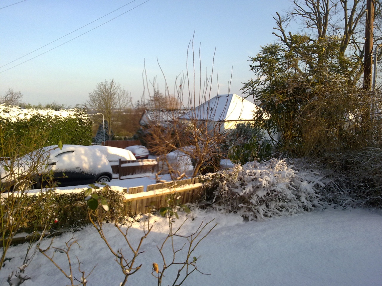 (↓玄関から見た隣り近所の雪景色)